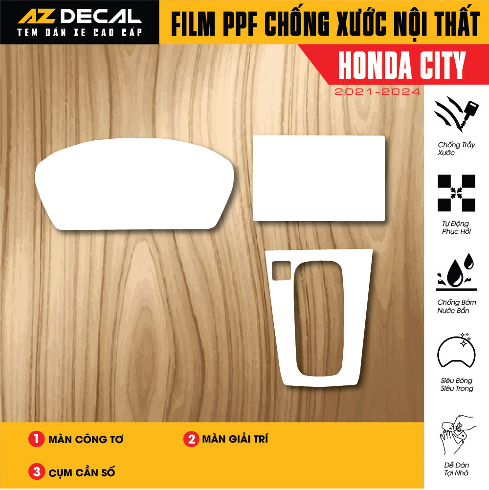 Dán PPF nội thất ô tô Honda City - miếng dán dẻo bảo vệ chống xước số 1. Sử dụng phôi dán PPF TPU - loại phim dán có độ bền cao nhất nói không với việc bị ố vàng, dán bền bỉ không bong tróc. Độ trong cao tăng độ sáng bóng cho nội thất sau khi dán, dán chuẩn đẹp và chính xác cho các phiên bản đời khác nhau của Honda City 2021, 2022, 2023, 2024