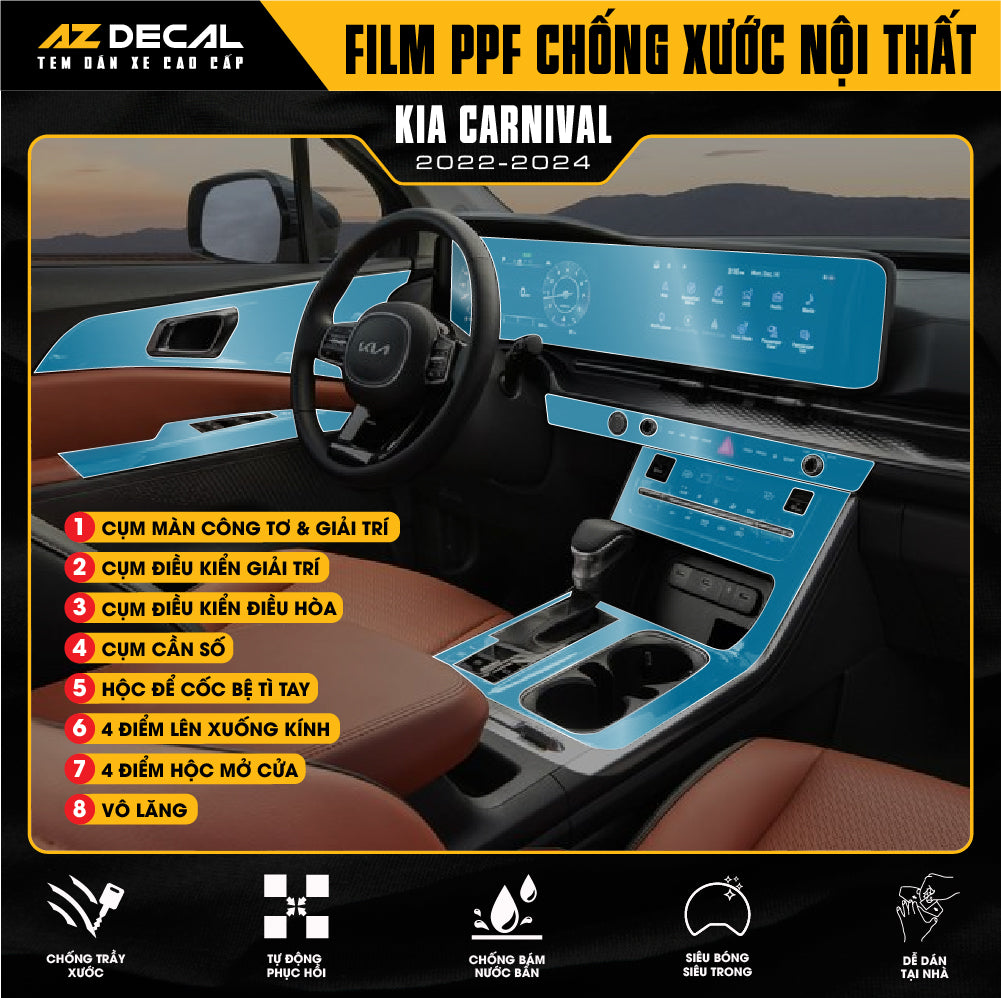 Dán PPF nội thất ô tô KIA Carnival - miếng dán dẻo trong suốt chống xước tăng độ sáng bóng làm mới ấn tượng. Phôi dán cao cấp tạo lớp bảo vệ chắc chắn bền đẹp, nói không với việc bị ố vang không bong tróc và thay thế bóc ra dễ dàng không để lại keo. Dán được cho mọi phiên bản đời khác nhau của KIA Carnival 2022, 2023, 2024