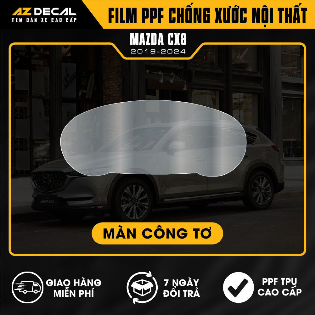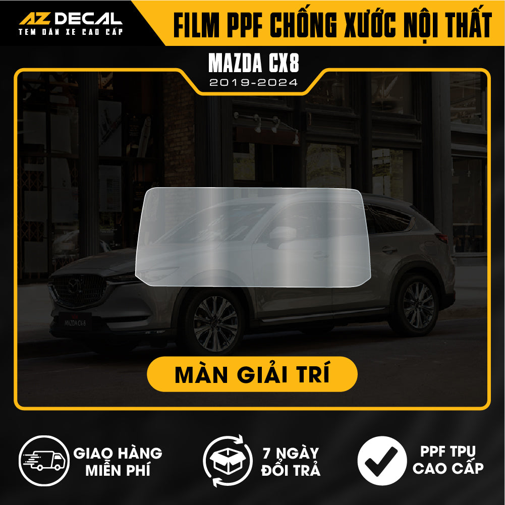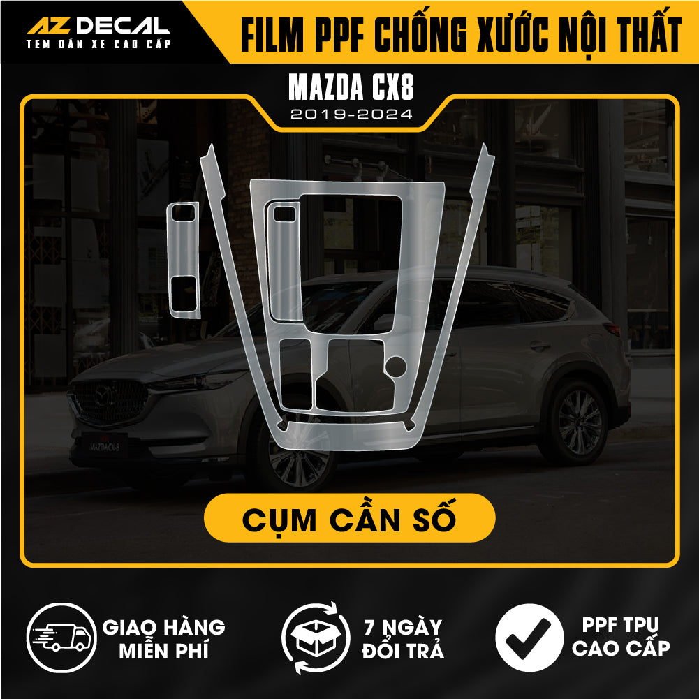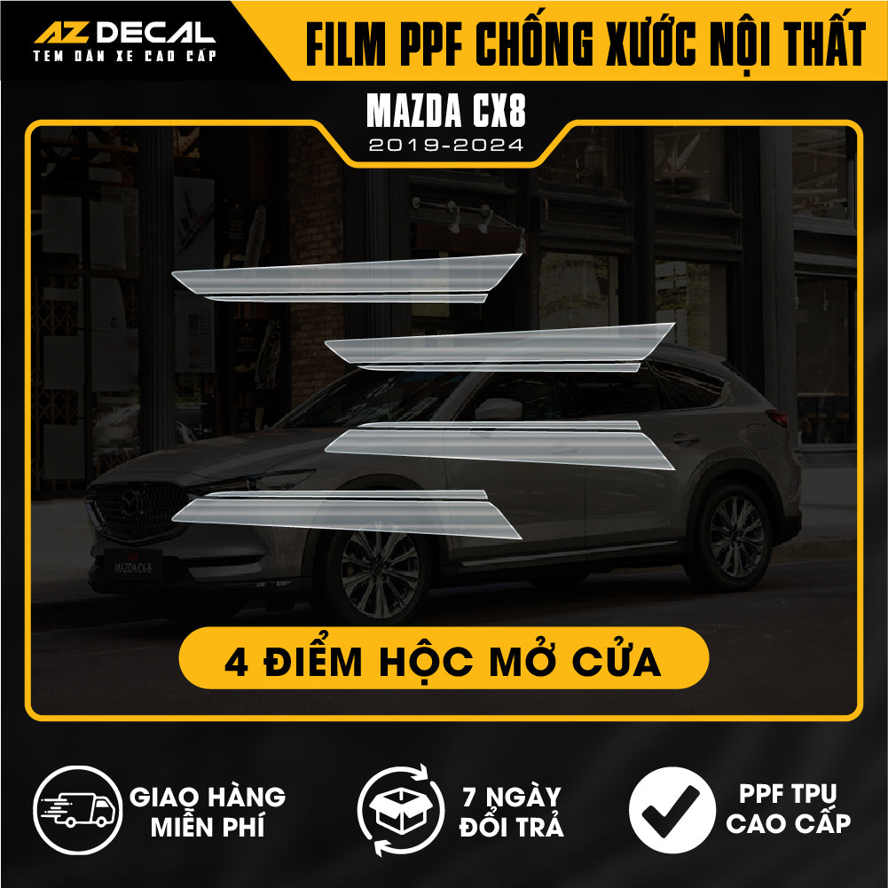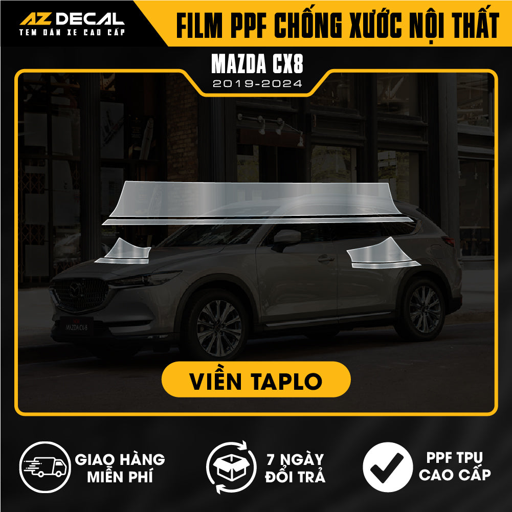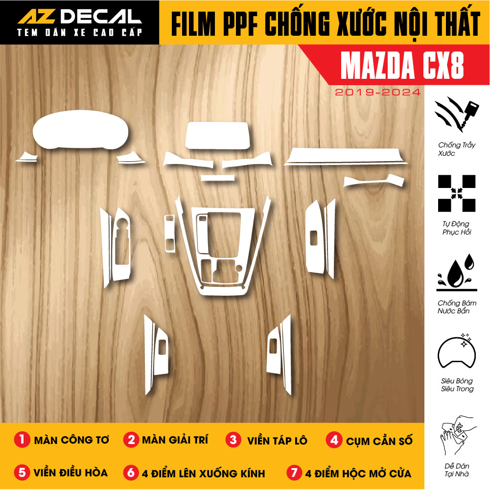 Dán PPF nội thất ô tô Mazda CX8 chống xước bảo vệ TỐT NHẤT số 1 hiện nay. Sử dụng phôi dán PPF TPU - có độ bền cao nhất và đặc biệt có khả năng tự phục hồi vết xước ấn tượng, tăng độ sáng bóng làm mới nội thất bền bỉ không ố vàng không bong tróc. Dán được cho mọi phiên bản đời xe của Mazda CX8 2019, 2020, 2021, 2022, 2023, 2024.