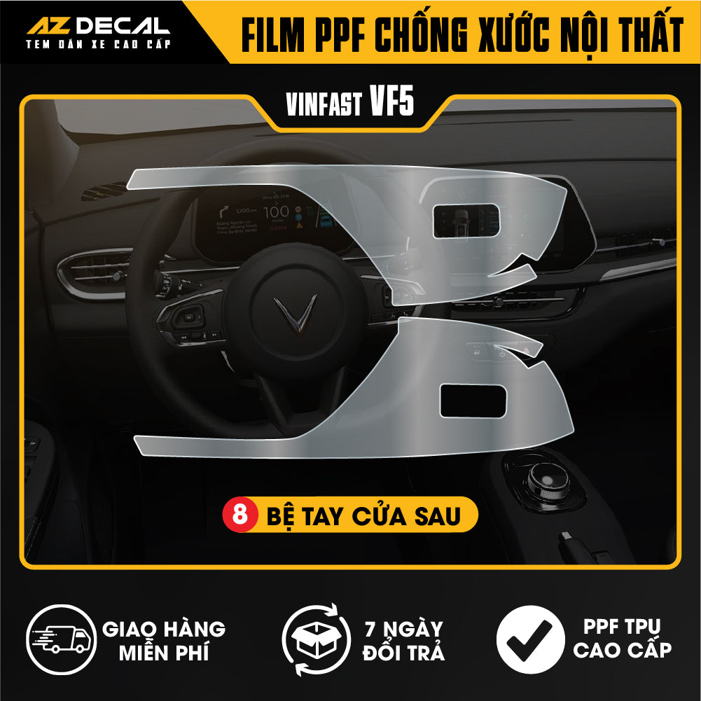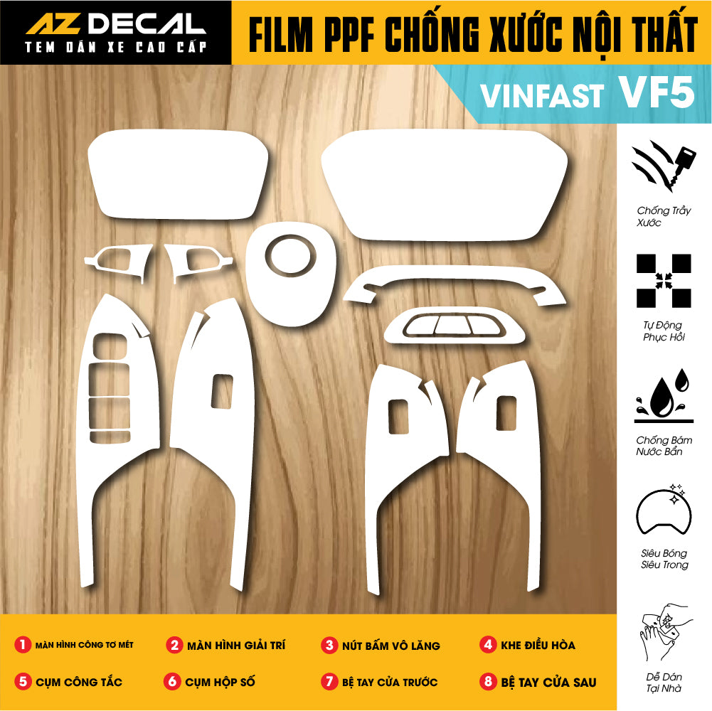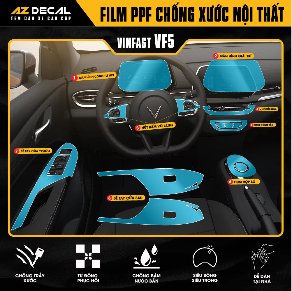Dán PPF nội thất ô tô Vinfast VF5 chống xước bảo vệ hiệu quả. Phôi dán cao cấp có độ đàn hồi tốt tạo lớp chắn bảo vệ các bề mặt nội thất khỏi trầy xước do va quệt với vật cứng, móng tay, chìa khóa,... Dán PPF giúp cho nội thất xe luôn an toàn và mới