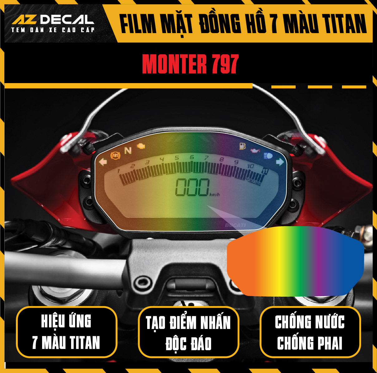 Miếng dán mặt đồng hồ 7 màu titan xe Ducati Monster 797 - Film dán bảo vệ độc đáo mang đến trải nghiệm mới lạ. Là sản phẩm mới nhất của Azdecal.vn, một phụ kiện chuyên dùng để bảo vệ mặt đồng hồ số của xe máy.