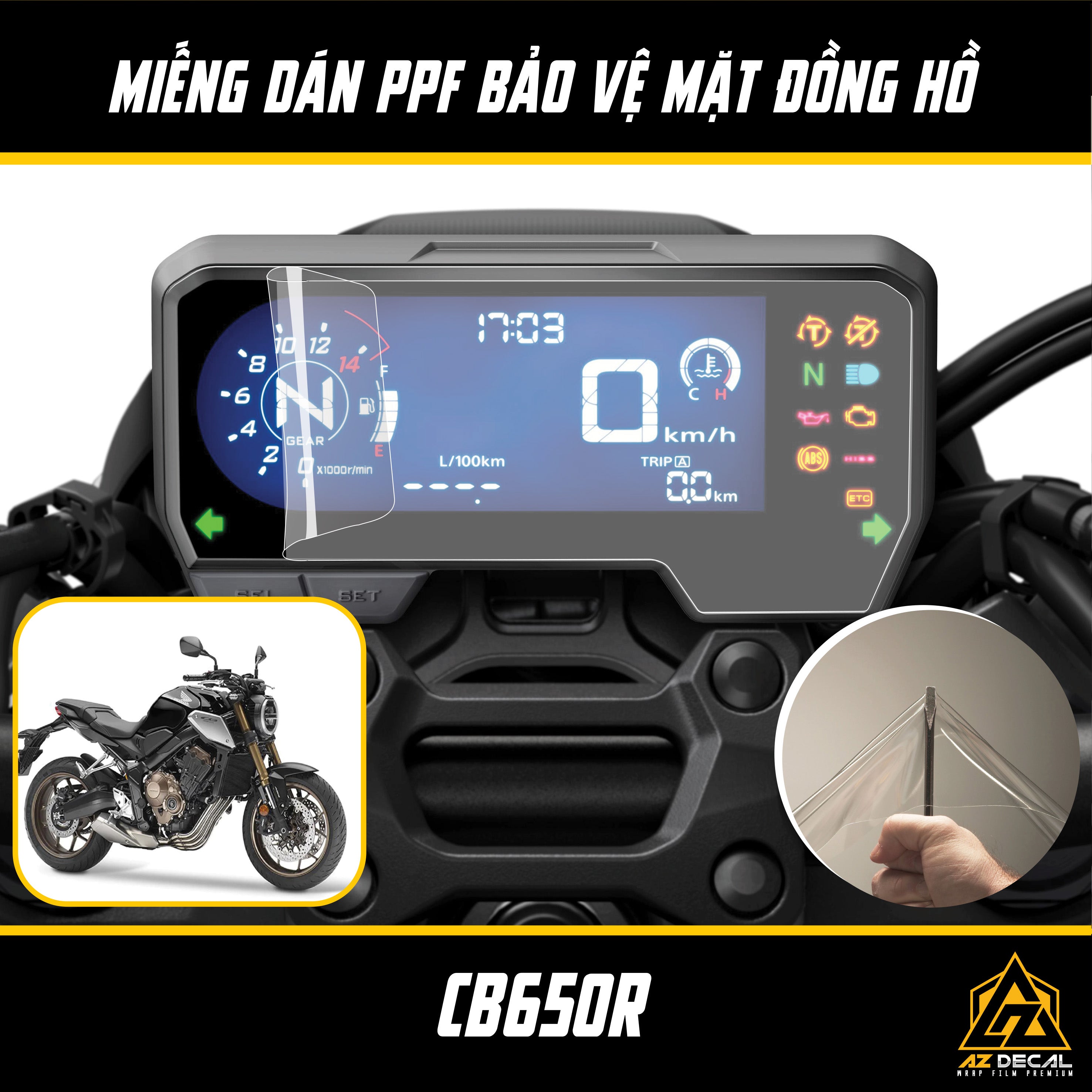 Miếng dán PPF mặt đồng hồ xe Honda CB650R tại Azdecal.vn là phụ kiện chuyên dùng để bảo vệ mặt đồng hồ số của xe máy nhờ độ dày và đàn hồi tốt.