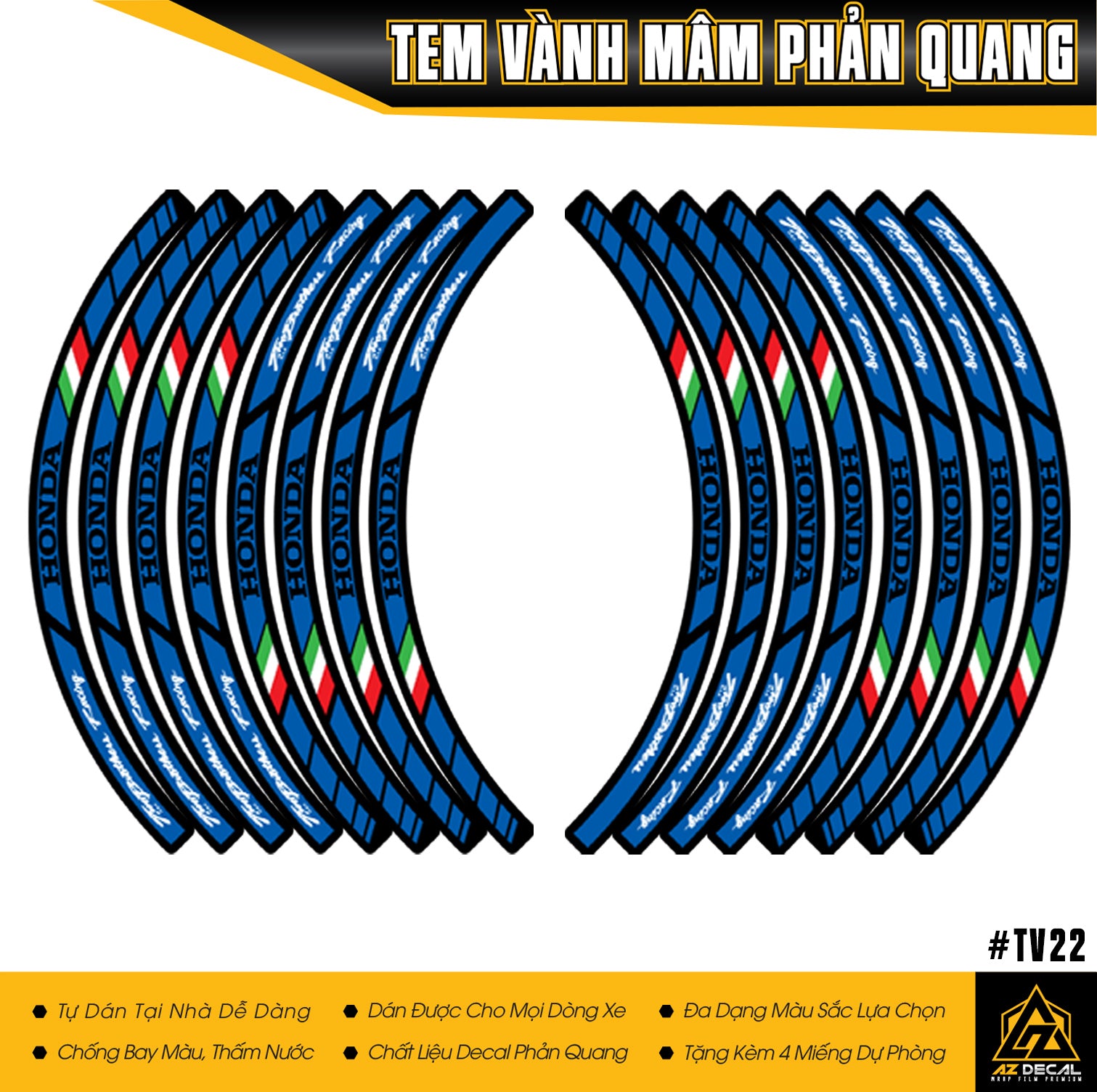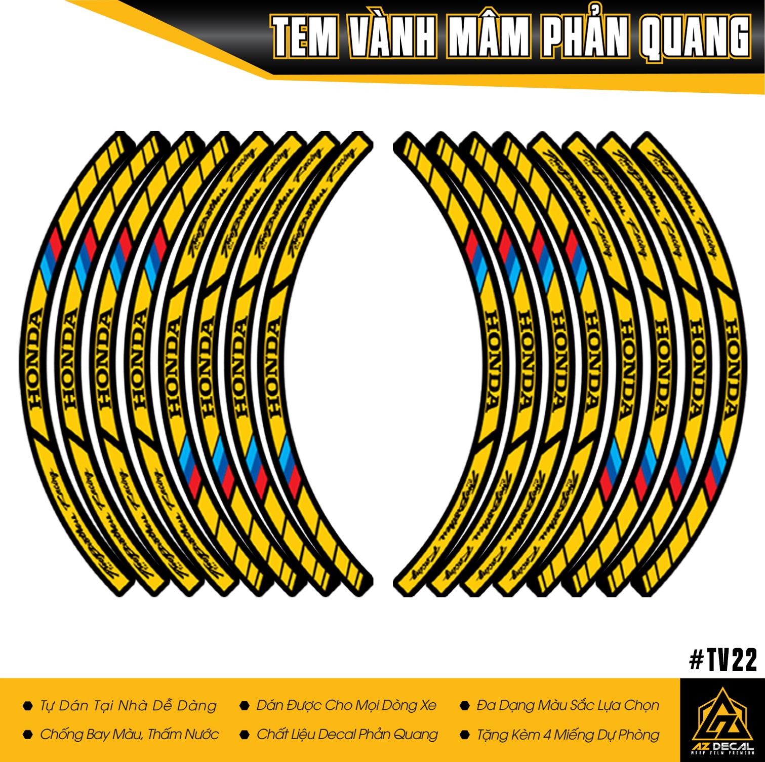Tem đã được cắt CNC sẵn với kích thước dán được cho bánh xe 14-17 inch, phù hợp với hầu hết các dòng xe phổ biến hiện nay như Honda Winner, Winner X, Wave, Future, RSX, Air Blade, SH, Vision,...