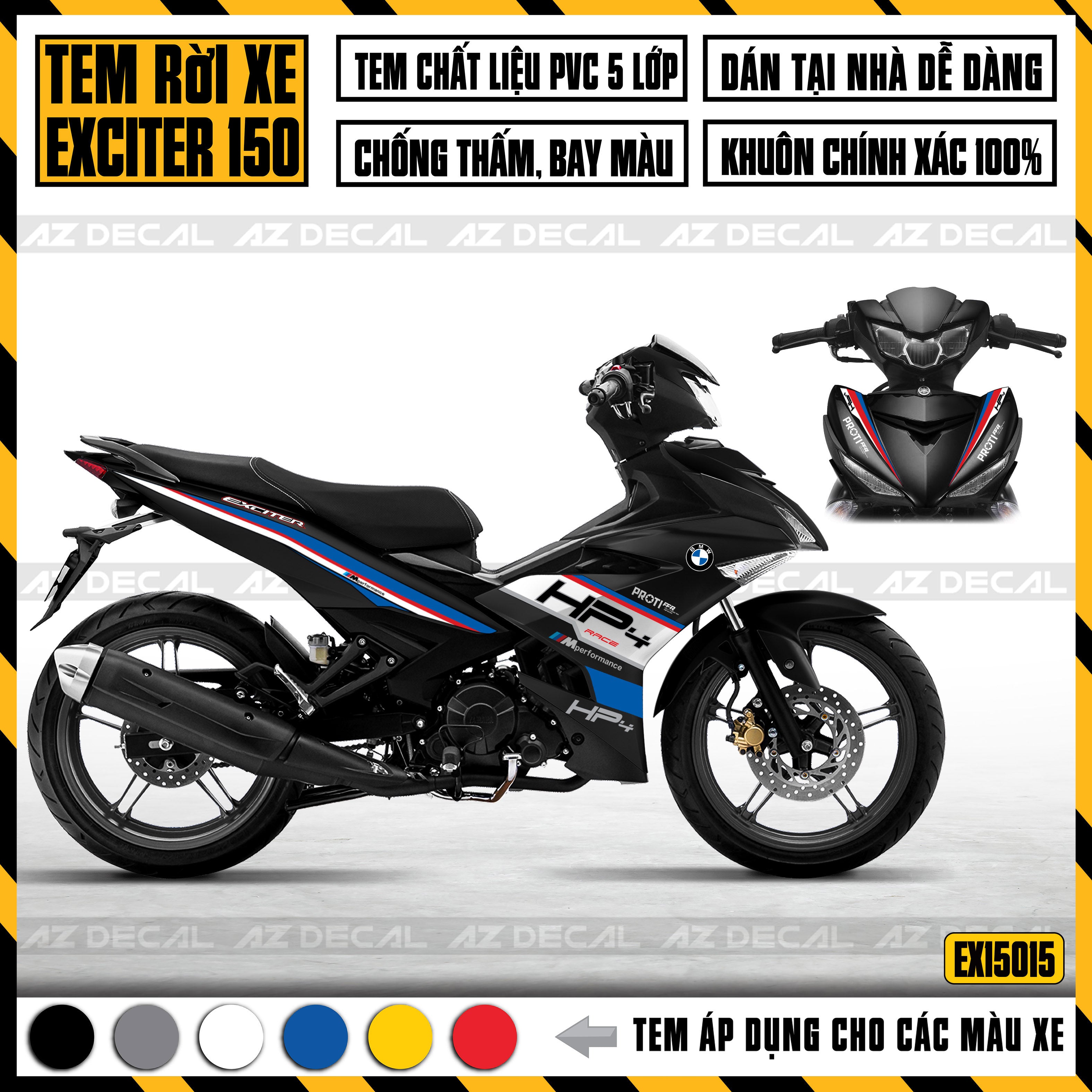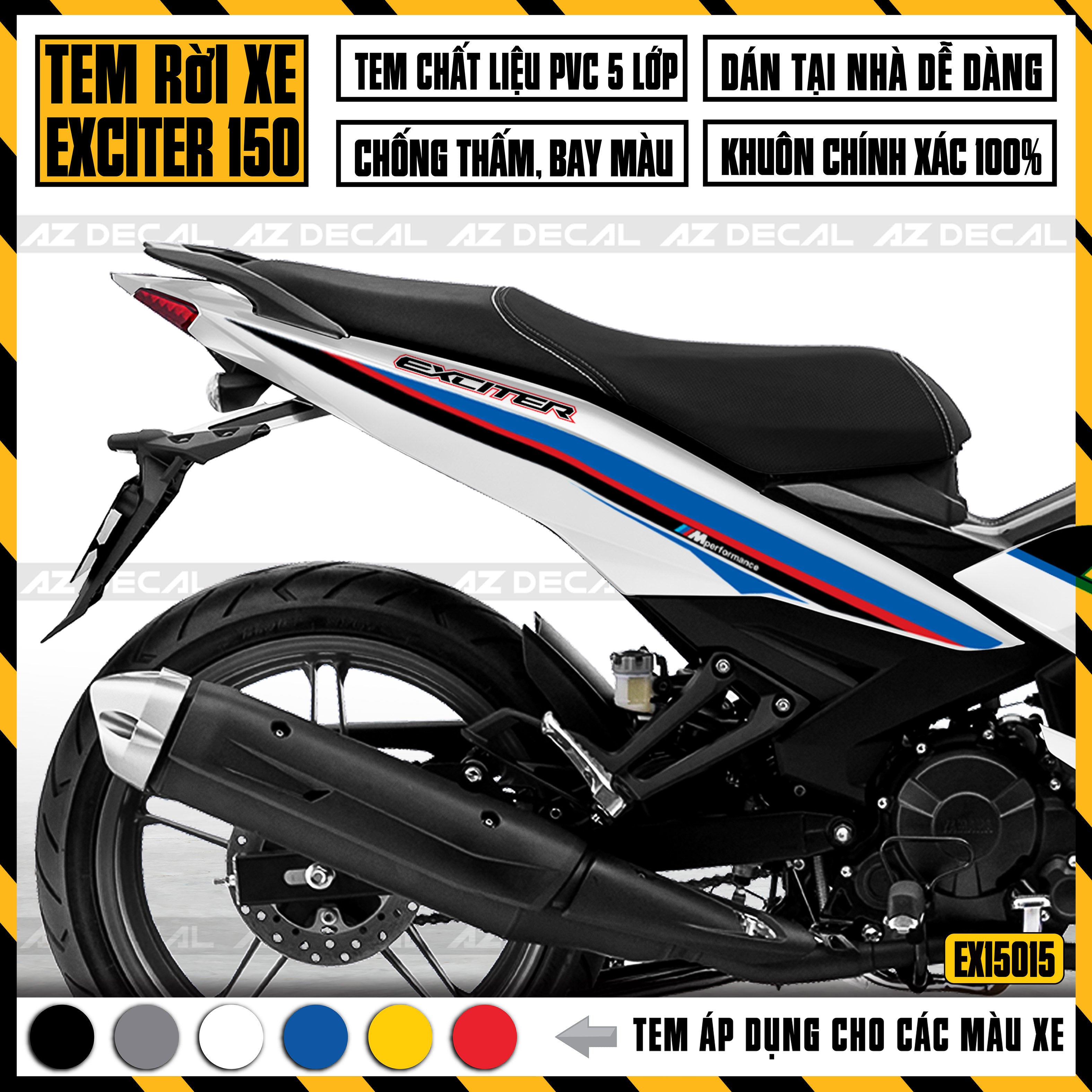Với chất liệu cao cấp và công nghệ sản xuất hiện đại từ Nhật Bản, Azdecal tự hào đem đến cho khách hàng mẫu tem Exciter 150 với chất lượng hàng đầu.