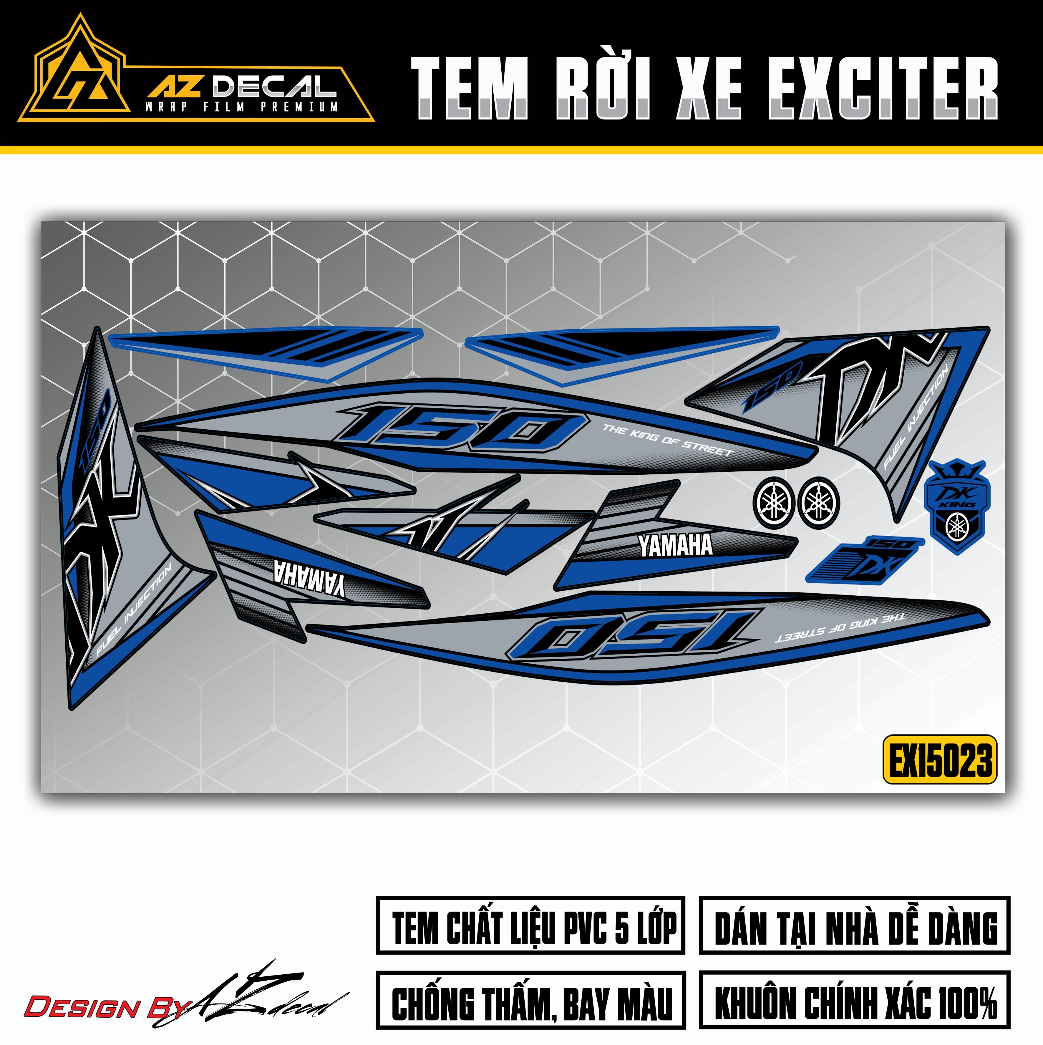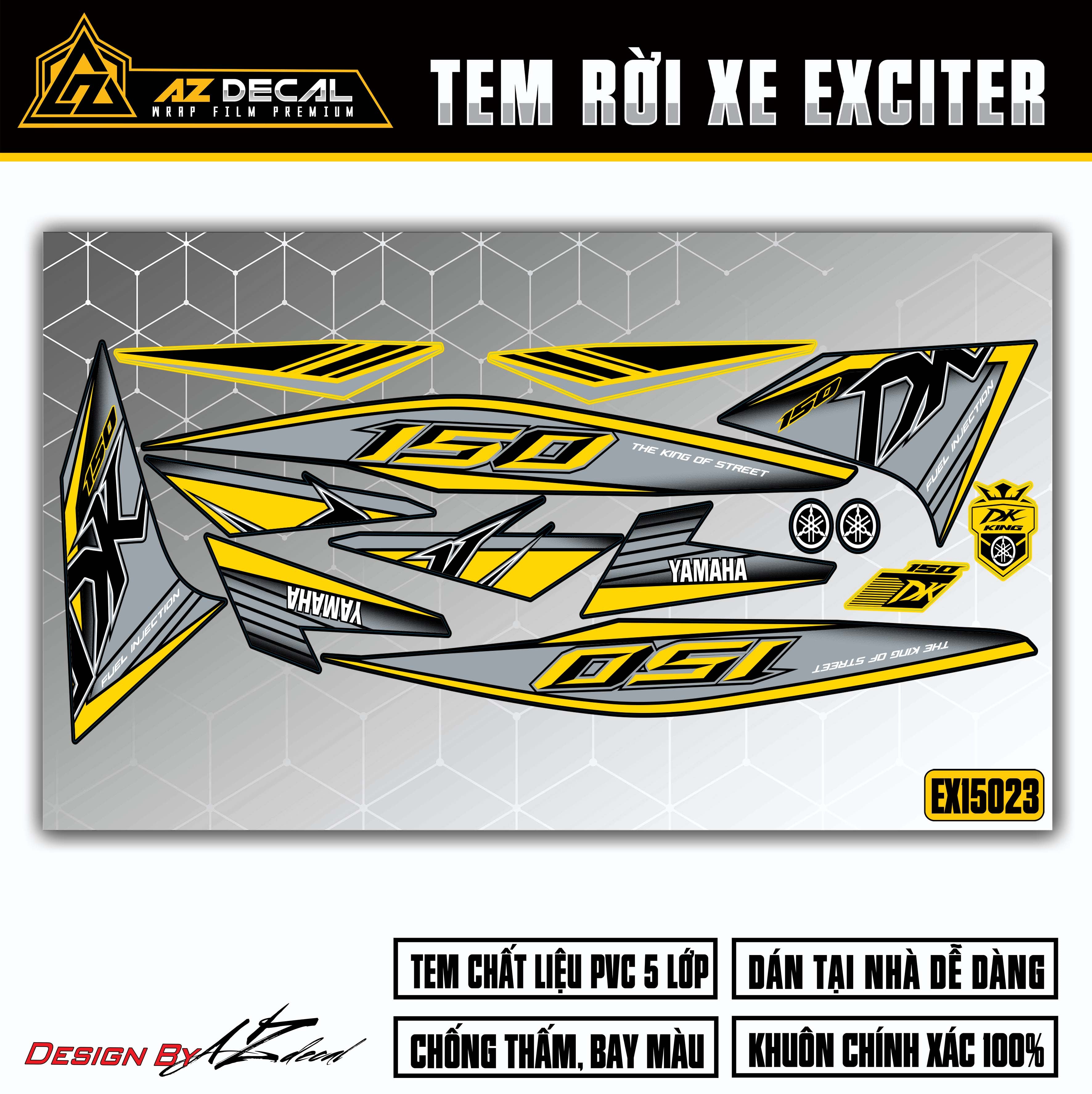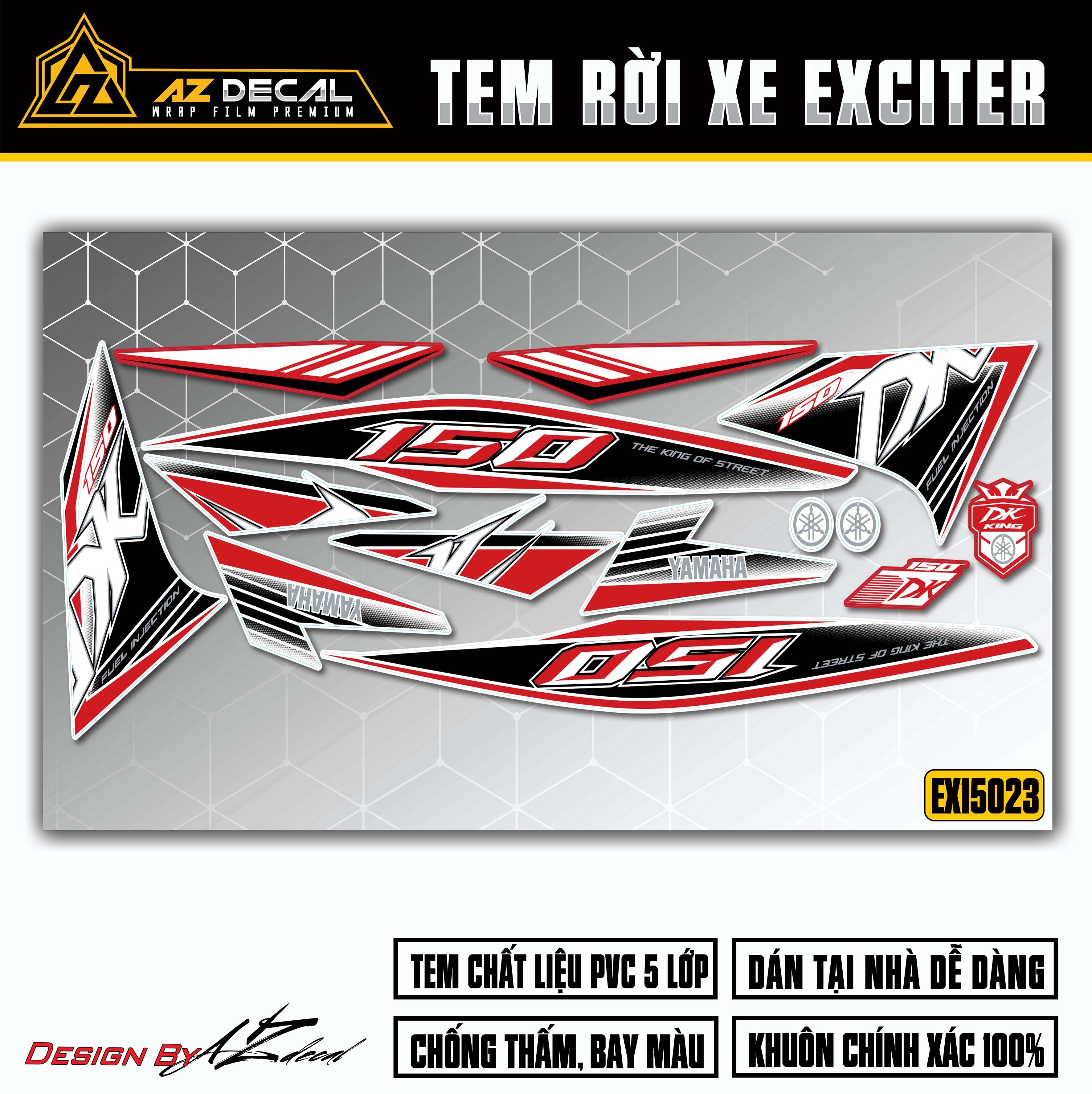 Với chất liệu cao cấp và công nghệ sản xuất hiện đại từ Nhật Bản, Azdecal tự hào đem đến cho khách hàng mẫu tem Exciter 150 với chất lượng hàng đầu.