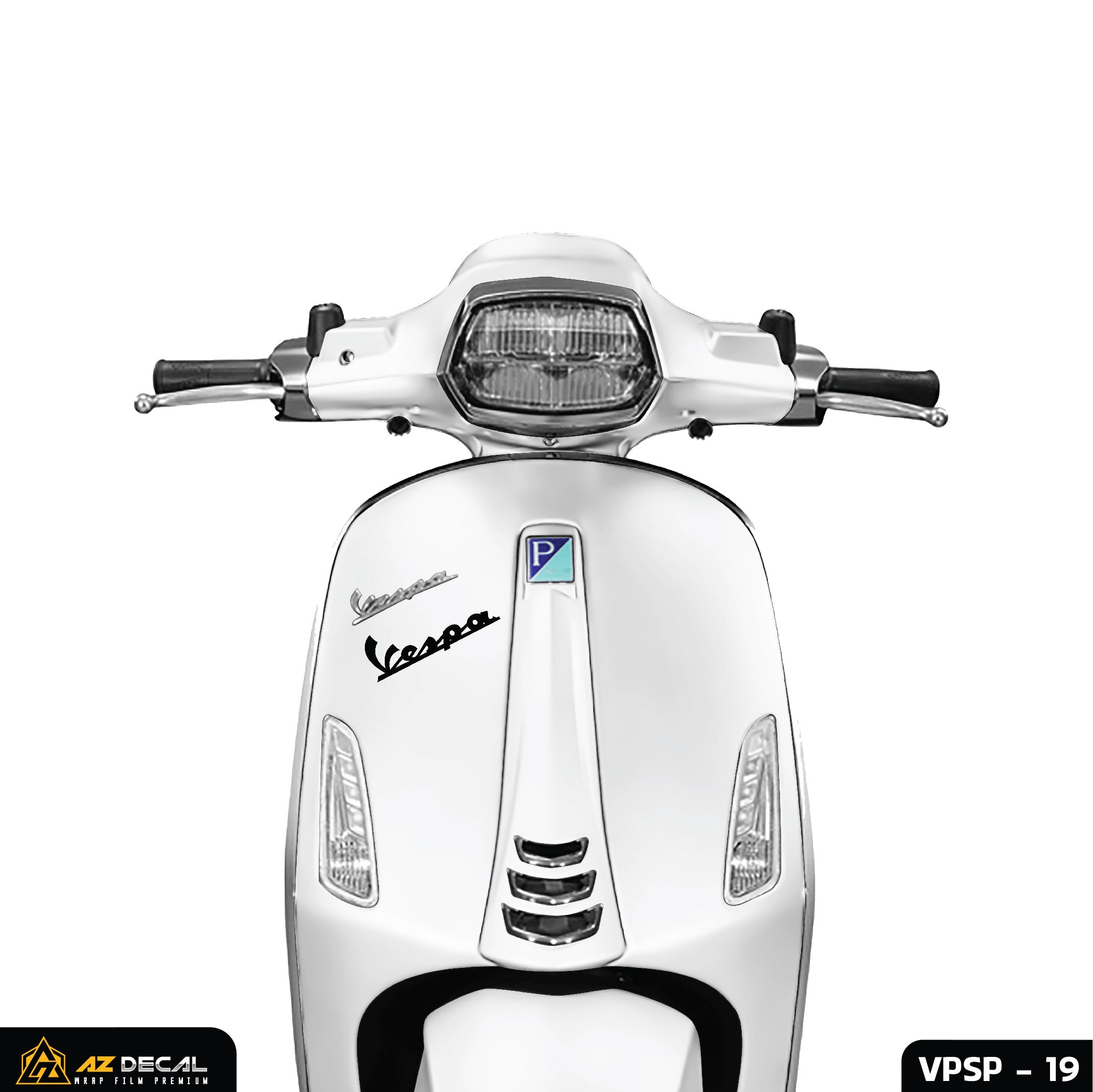 Thiết kế khá đơn giản với logo dòng xe Vespa cỡ lớn nổi bật tạo thêm điểm nhấn trên xe. Mẫu tem có hai lựa chọn màu sắc Đen và Trắng tùy thuộc theo màu xe của khách hàng.