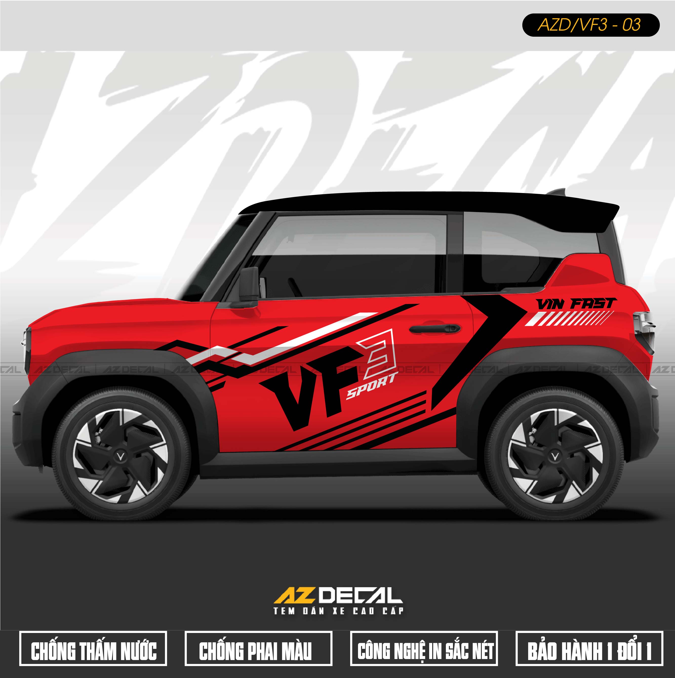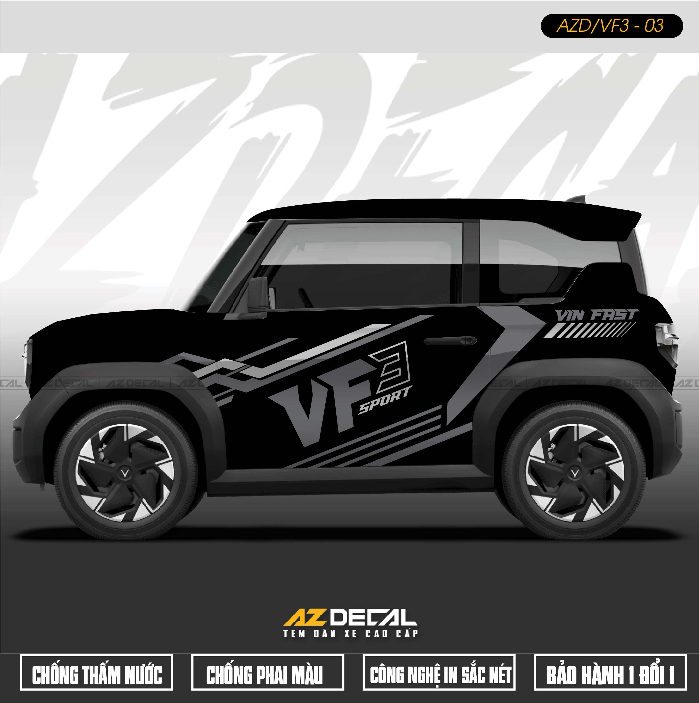 Dán tem Xe Vinfast VF3 - nâng tầm phong cách cho chiếc xe với những bộ tem đẹp độc mới lạ, thể thao, khỏe khoắn và ấn tượng. Mẫu mã đa dạng độc nhất được thiết kế và thi công tại AZDECAL.