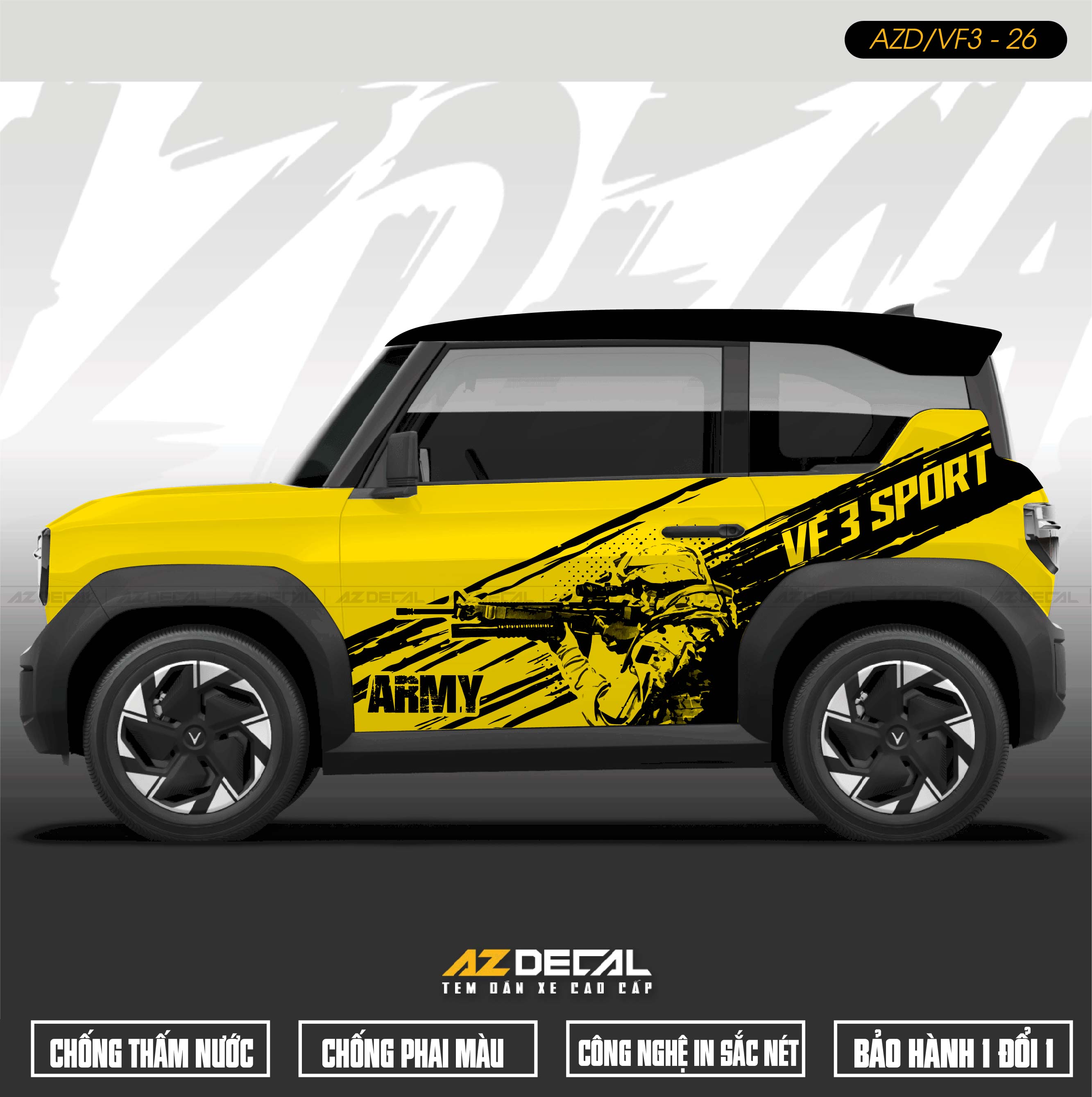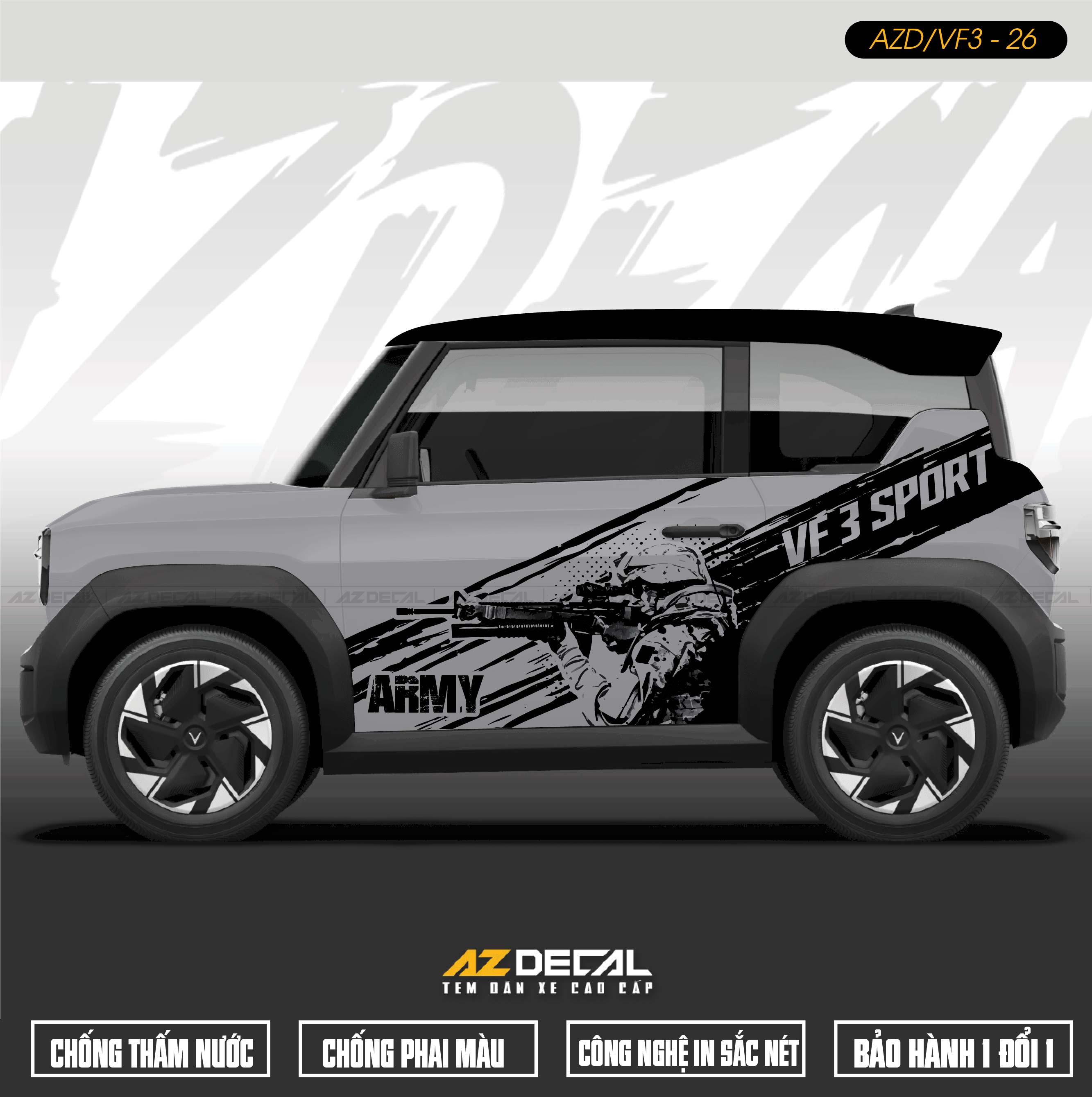 Dán tem Xe Vinfast VF3 - nâng tầm phong cách cho chiếc xe với những bộ tem đẹp độc mới lạ, thể thao, khỏe khoắn và ấn tượng. Mẫu mã đa dạng độc nhất được thiết kế và thi công tại AZDECAL.